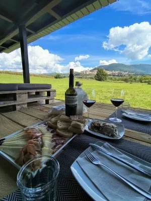 The picnic takes place in the vineyard in front of a unique view of Assisi, with the Basilica of St. Francis just 800 meters away. Your picnic lunch includes 1 bottle of your choice of Colderba, Colle Asio, Campo delle Grazie, or Eremo wine to enjoy paired with delicious local products including Typical Umbrian bread, SAIO extra virgin olive oil, Artisanal Pecorino cheese of medium seasoning accompanied by grape jam, Artisanal Caciotta cheese with black summer truffle, Artisanal Torta al testo, Artisanal typical Umbrian cold cuts, Porchetta di Costano, a Traditional Umbrian dessert, and mineral water. A variation of the menu for celiacs and vegetarians is available on request.